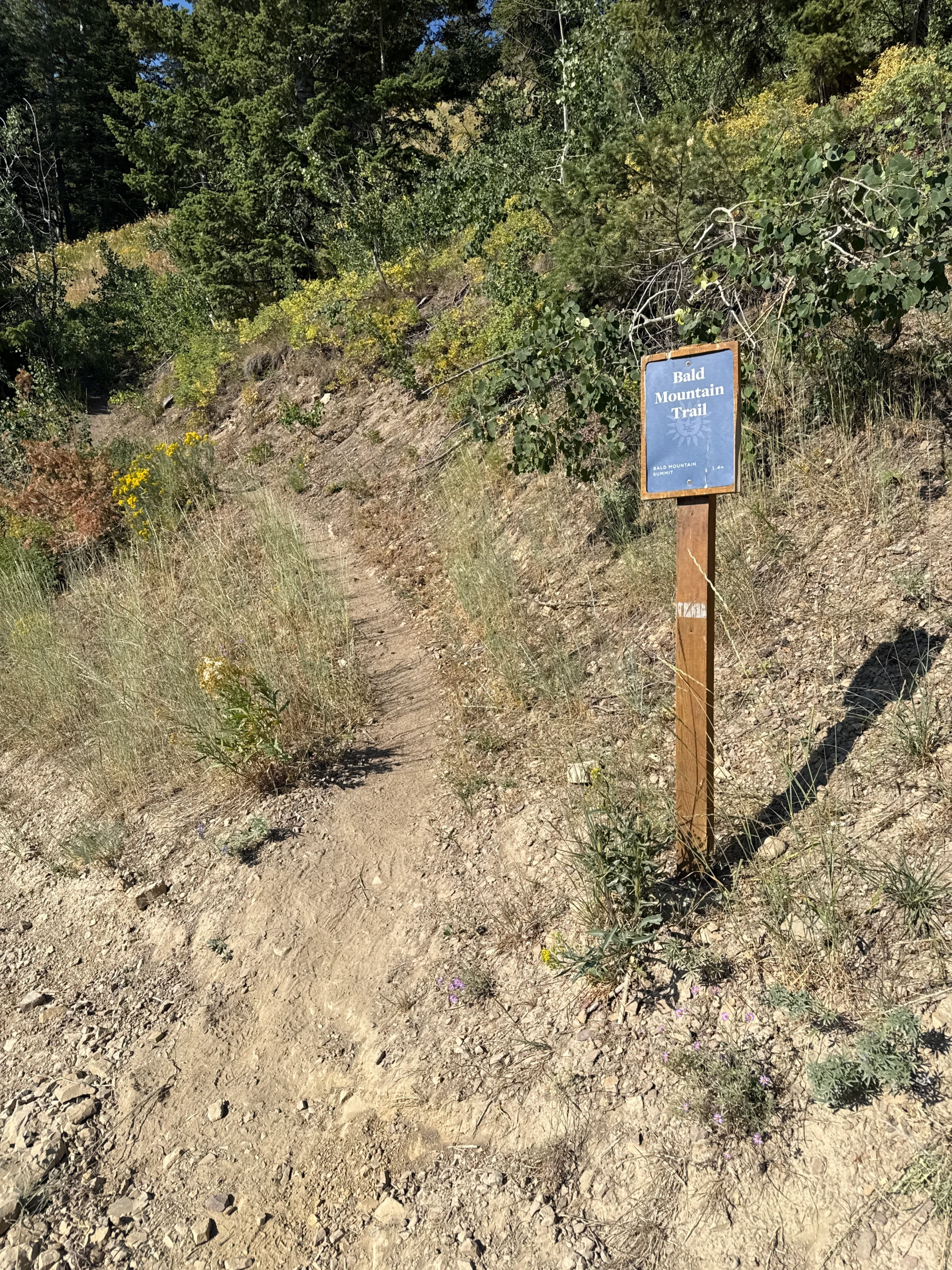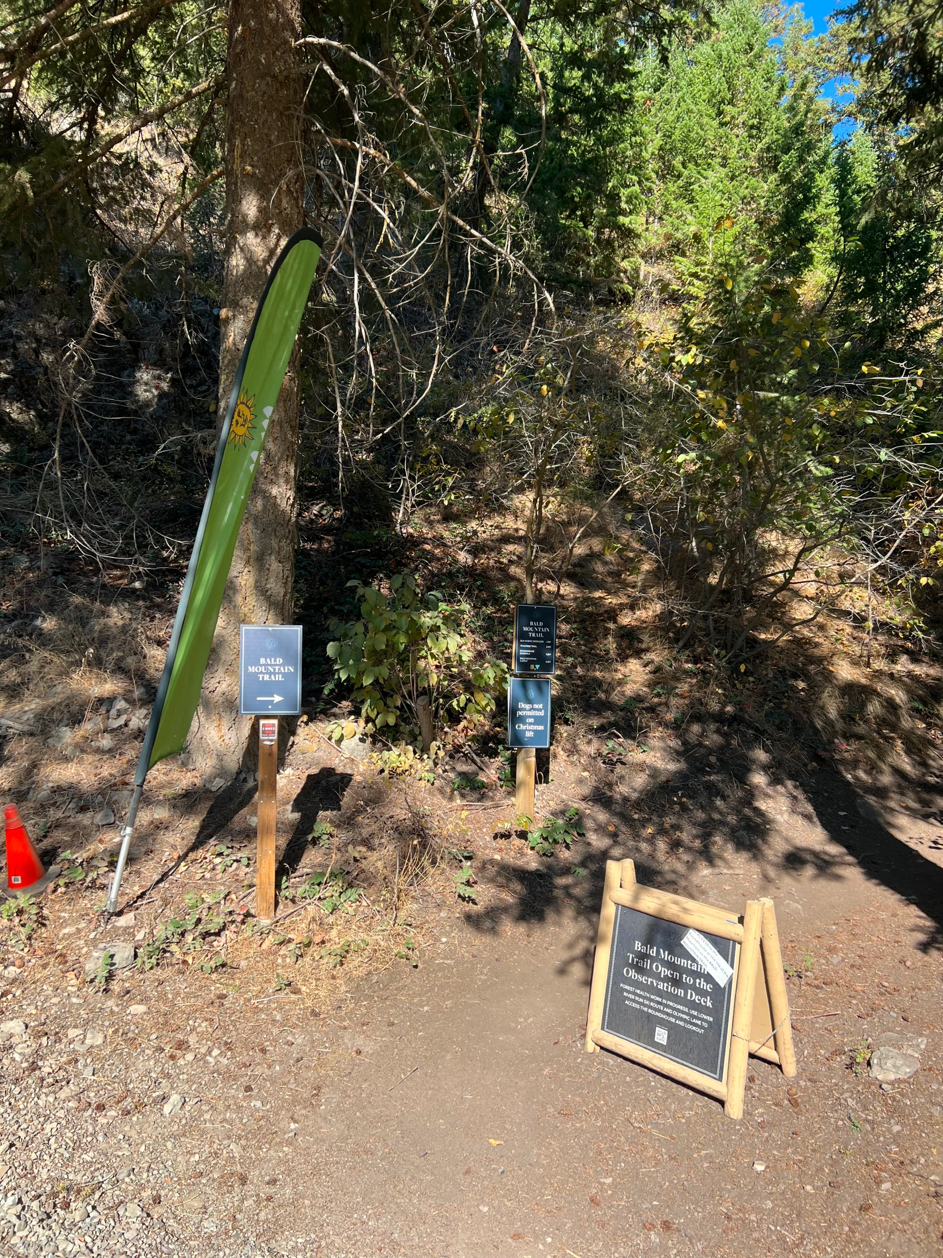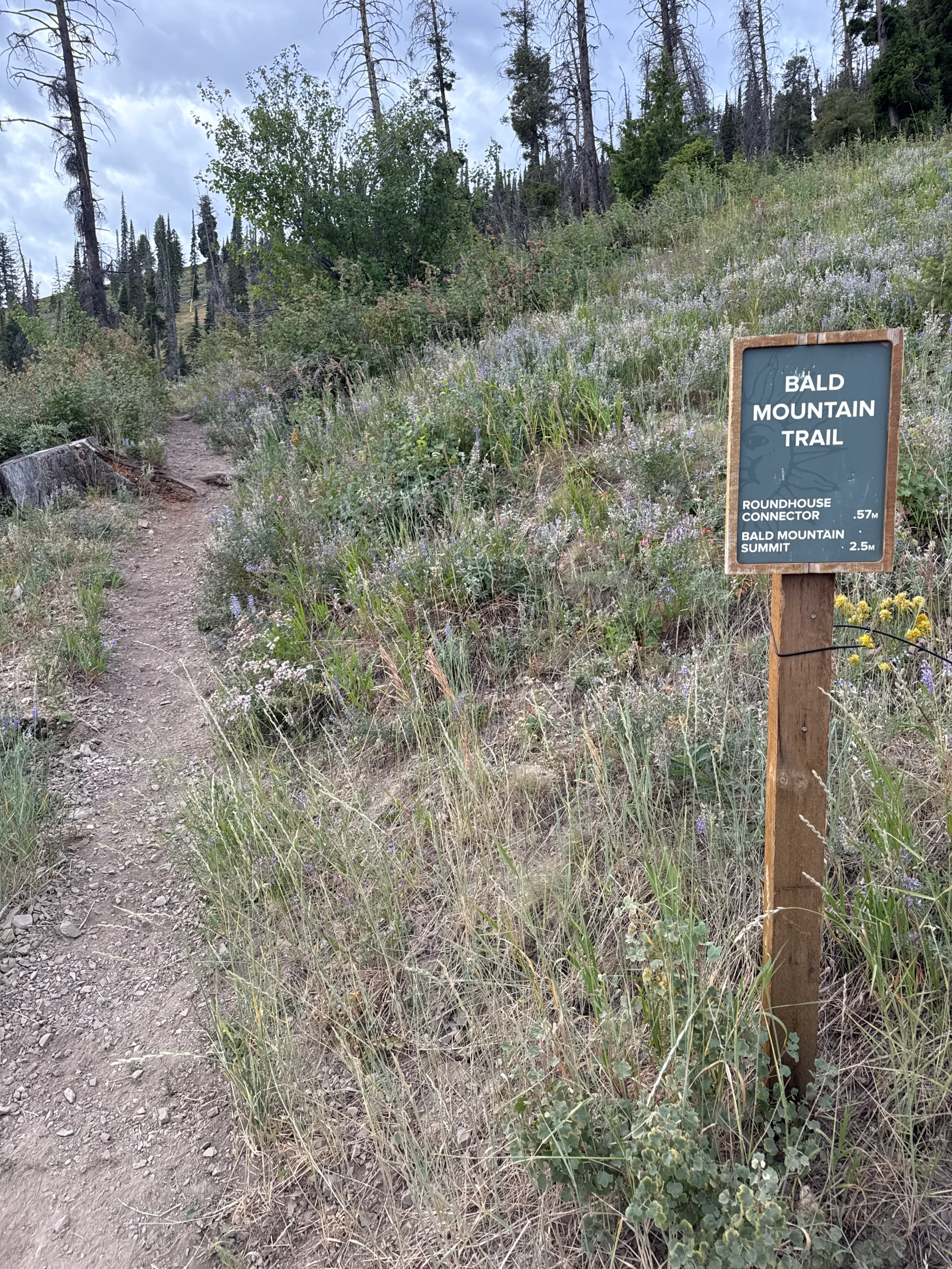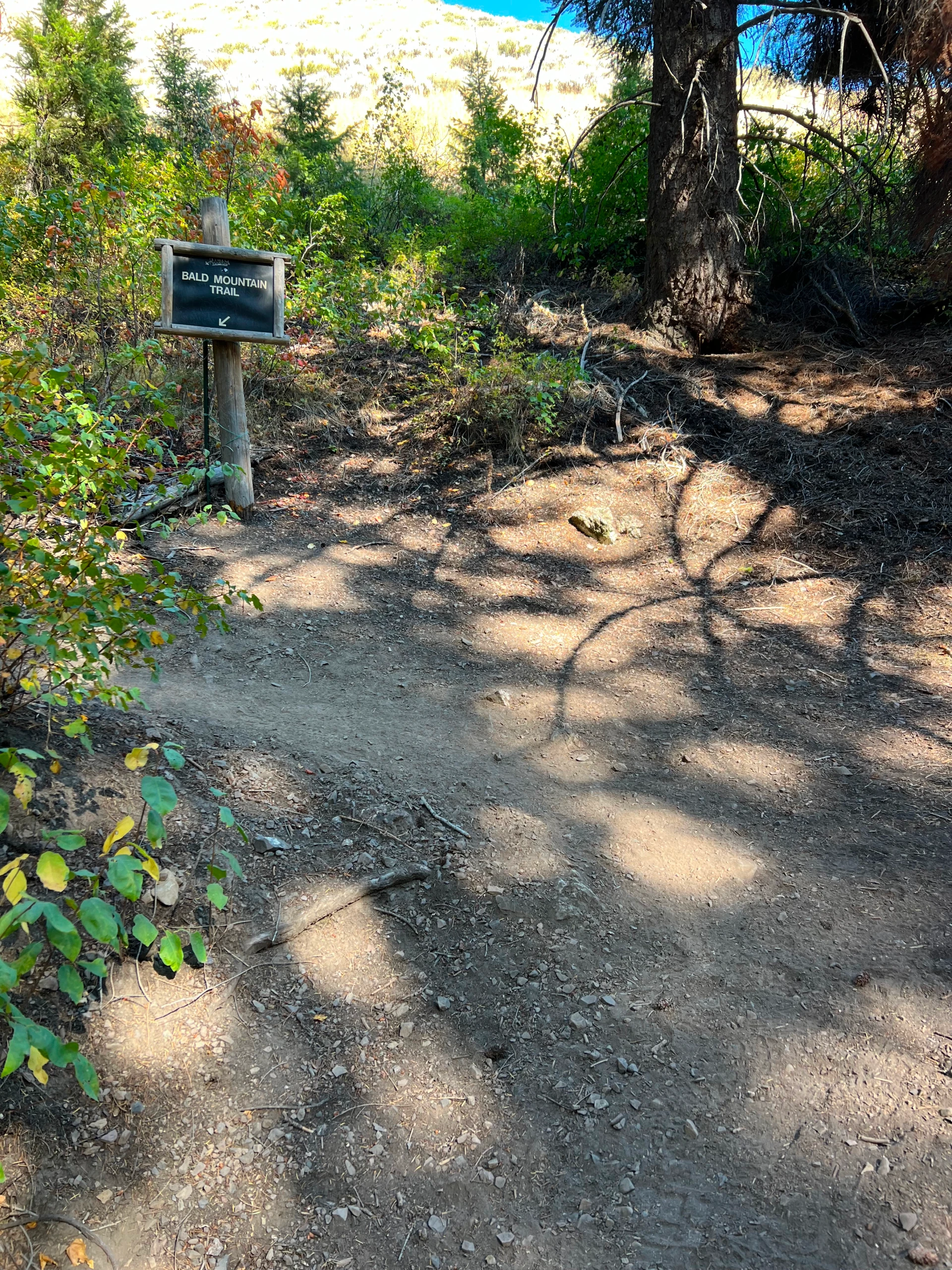 At 3.6 miles, cross a road. During winter this is the Roundhouse Lane cat track. Across the road is a sign marking Bald Mountain trail. Continue straight past the sign.