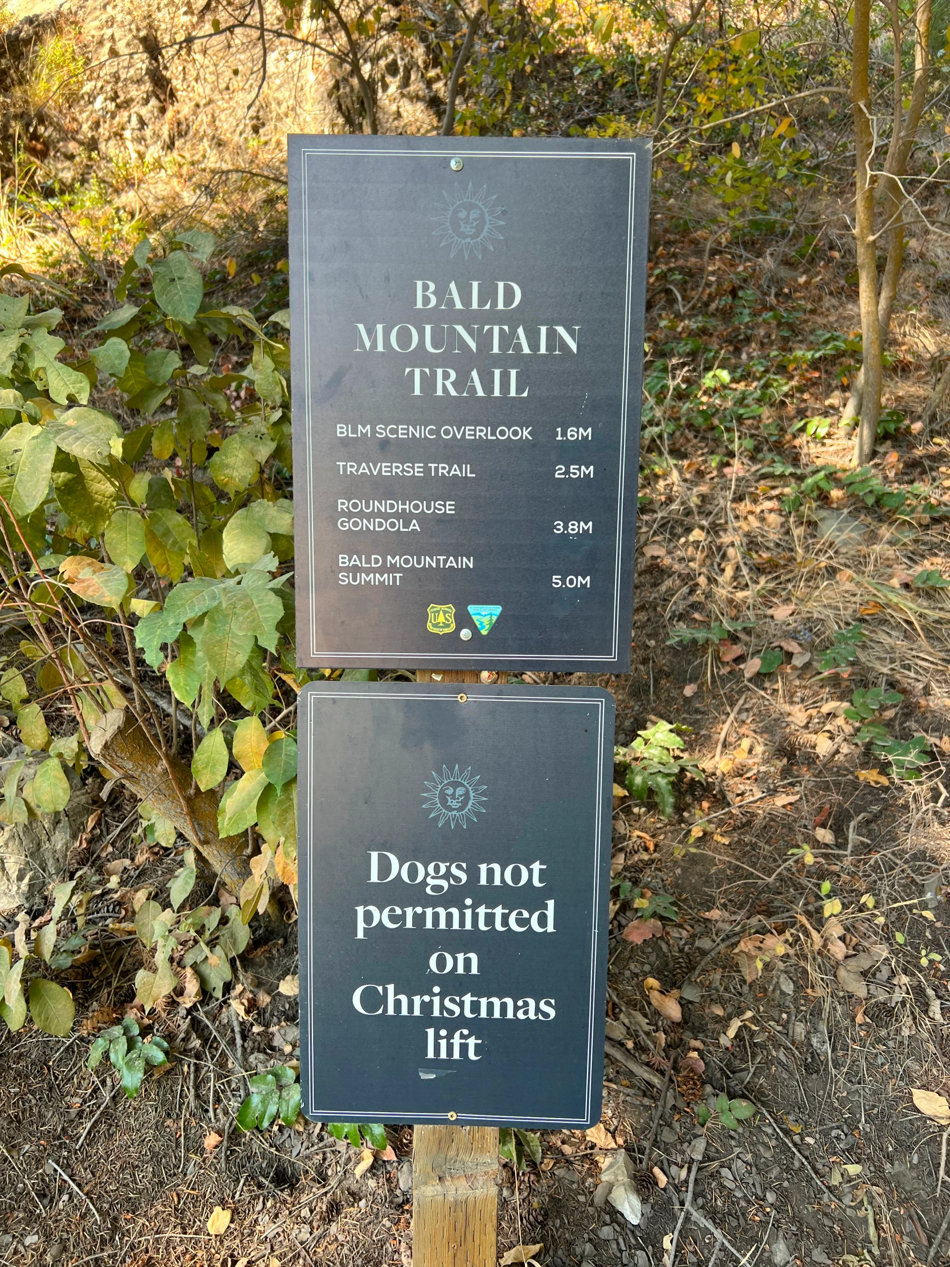 Right after the memorials, the trail hairpins right and just after the 3-mile mark, come to the signed junction of the Bald Mountain Summit trail and the Roundhouse Connector. Continue straight on the Bald Mountain Summit trail.