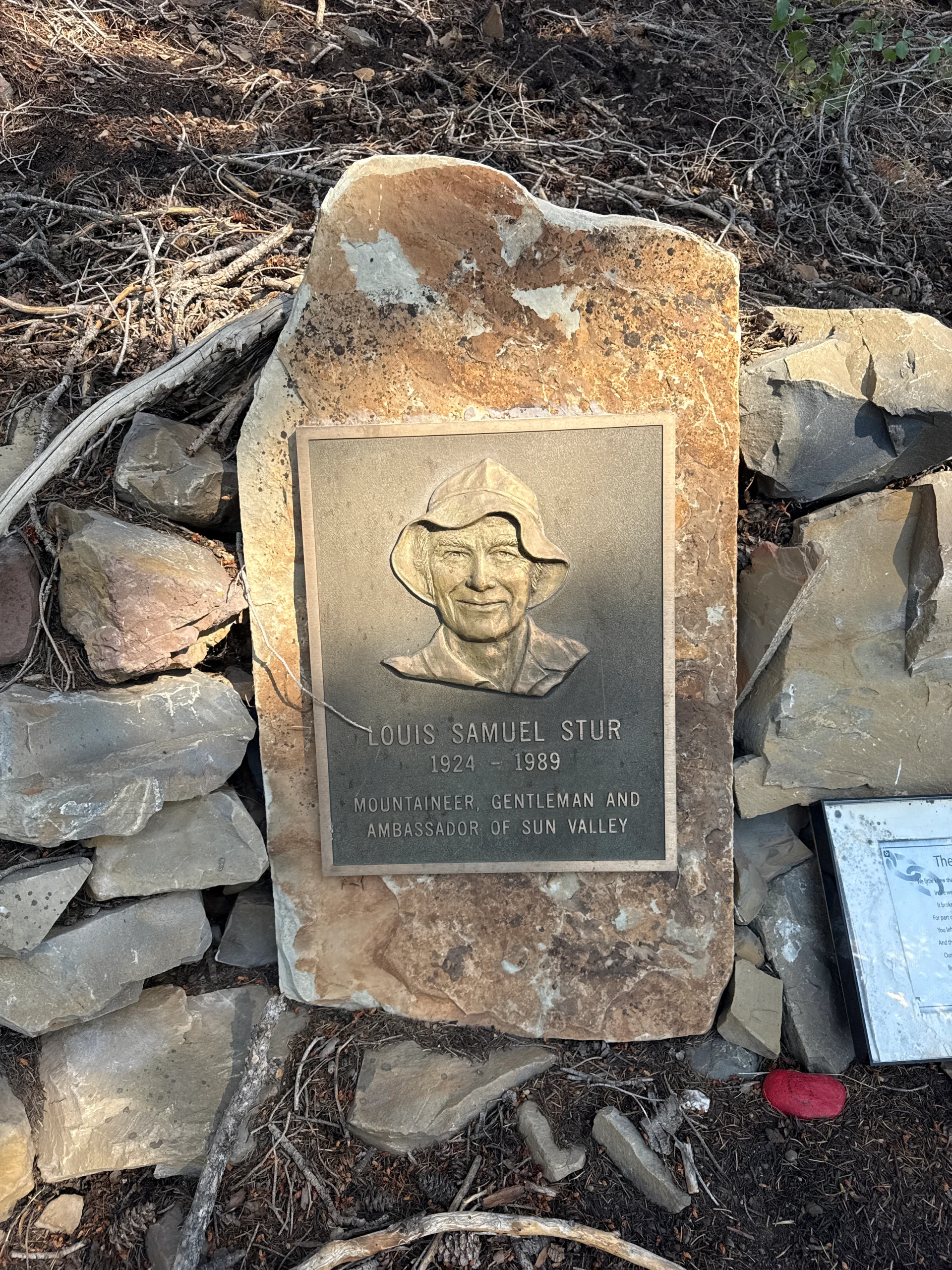 At about the 3.5-mile mark, come to another pair of memorials in a small, shaded grotto. First, there is a plaque honoring Louis Samuel Stur, one of Sun Valley’s legendary mountaineers. Stur came to Sun Valley in 1951 where he first served as a ski instructor and eventually became the director of Sun Valley hotels. But his greatest gift to the region was the development of hiking routes throughout the Sawtooth Mountains. Stur died while hiking Mount Ebert in 1989.