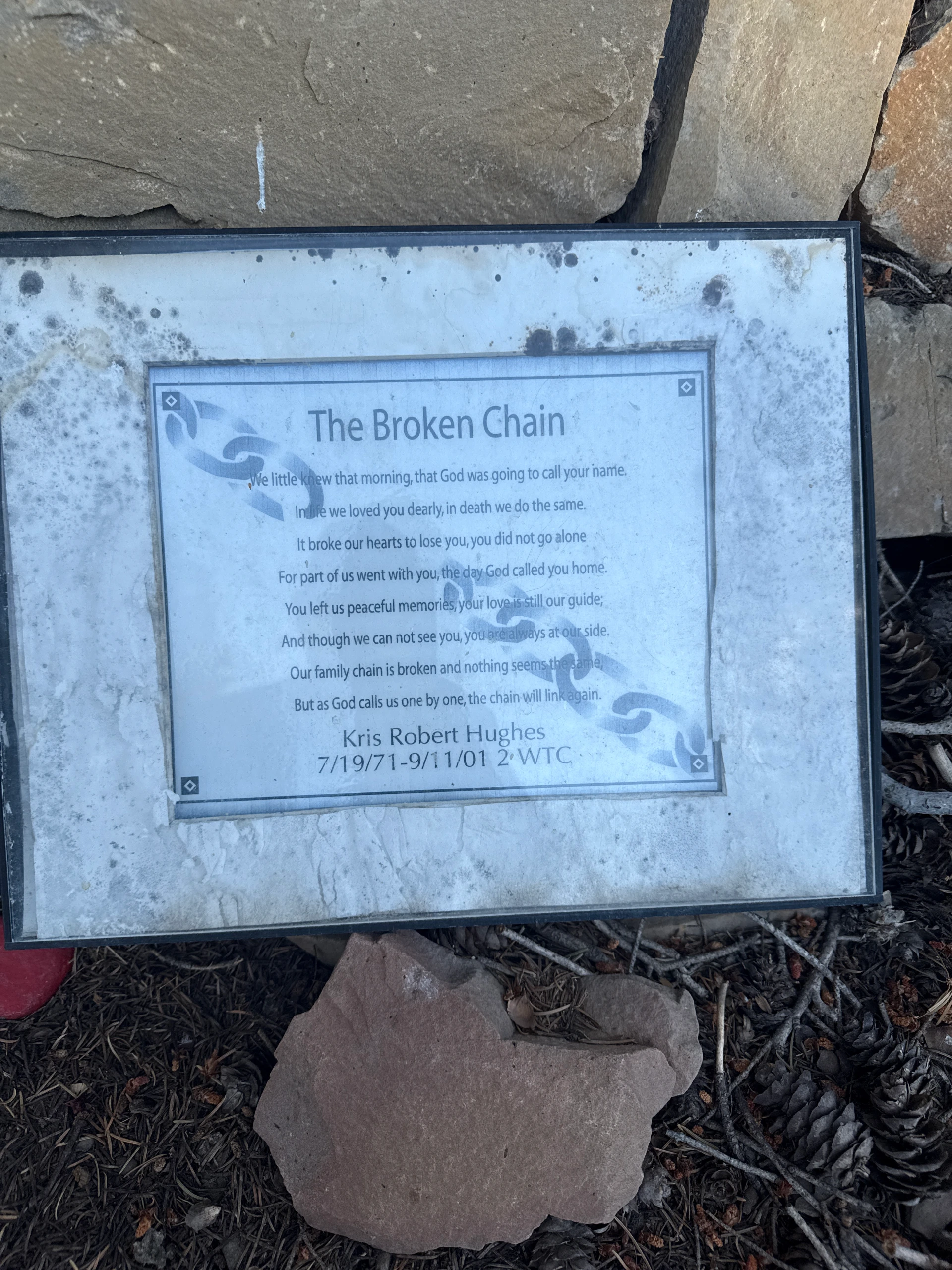 The second memorial is a framed poem named “Broken Chain” which is dedicated to Kris Robert Hughes, who died at age 30 on September 11, 2001, while working in the World Trade Center. Hughes, a loyal Ohio State Buckeye, dreamed of retiring from his finance career at age 40 and moving to Sun Valley to open a fly-fishing shop. In 2011, the year he would have turned 40, his family held a month-long celebration of his life in Sun Valley and during the celebration, they placed the poem in the grotto.