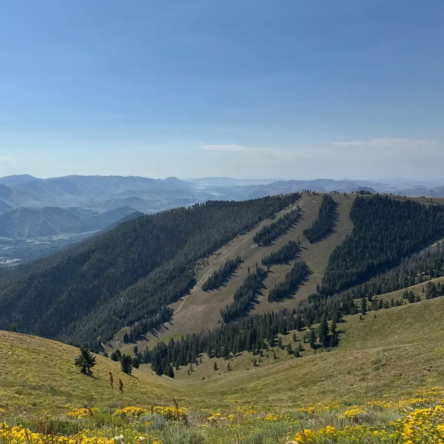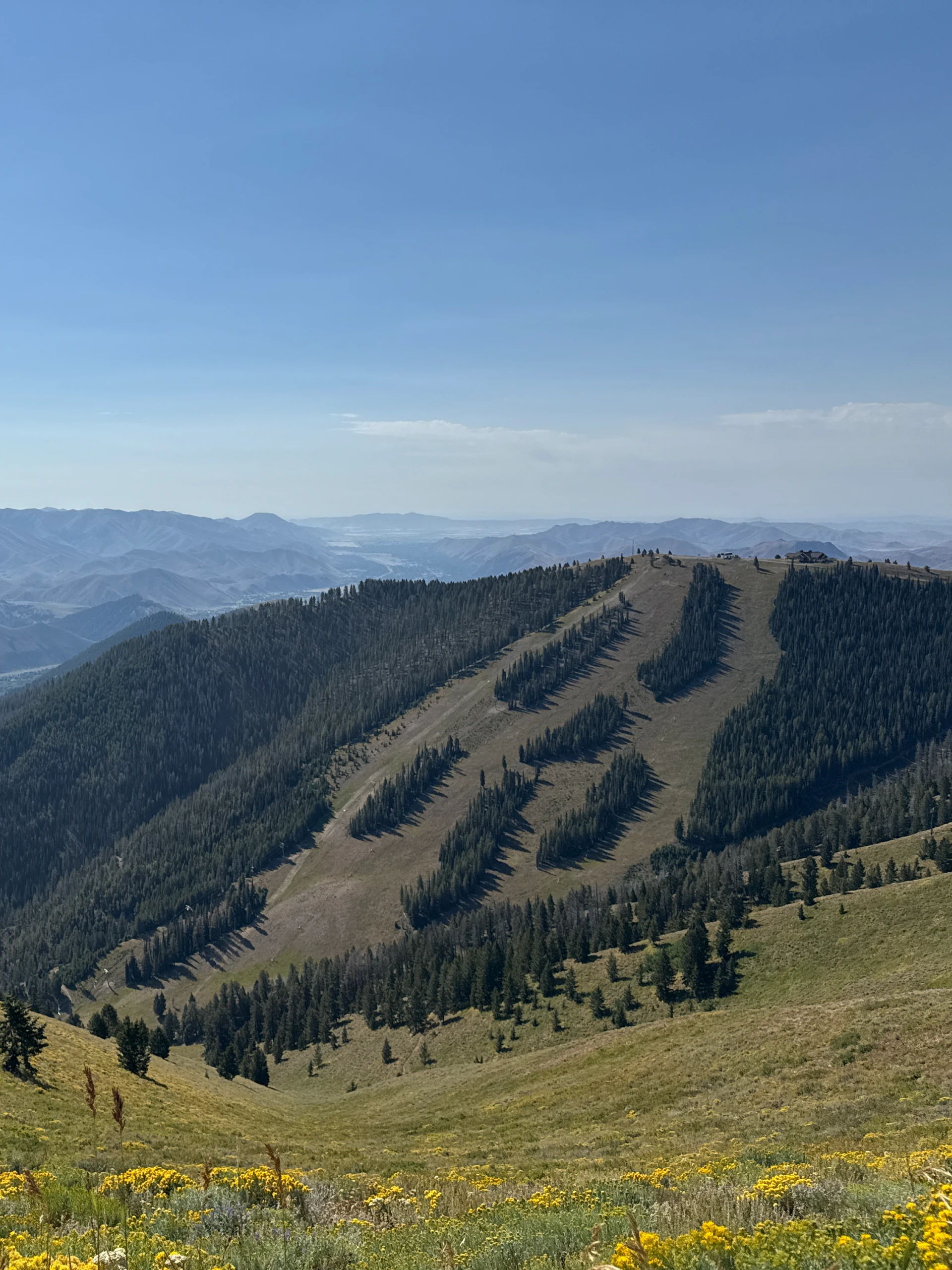Take some time to catch your breath and enjoy the 360° views at the top of Baldy. As you walk with the trail to your back, Seattle Ridge emerges in the distance and beyond it, the City of Hailey.