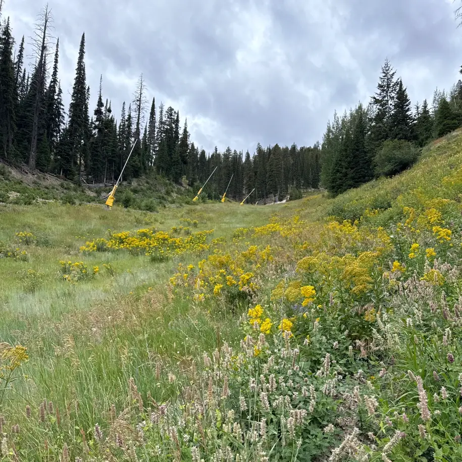After the junction, the trail continues along an open ridge and you soon pass under the Frenchman’s lift line. At 3.3 miles, come to the Flying Squirrel ski run and make a quick hairpin turn back towards the lift line.