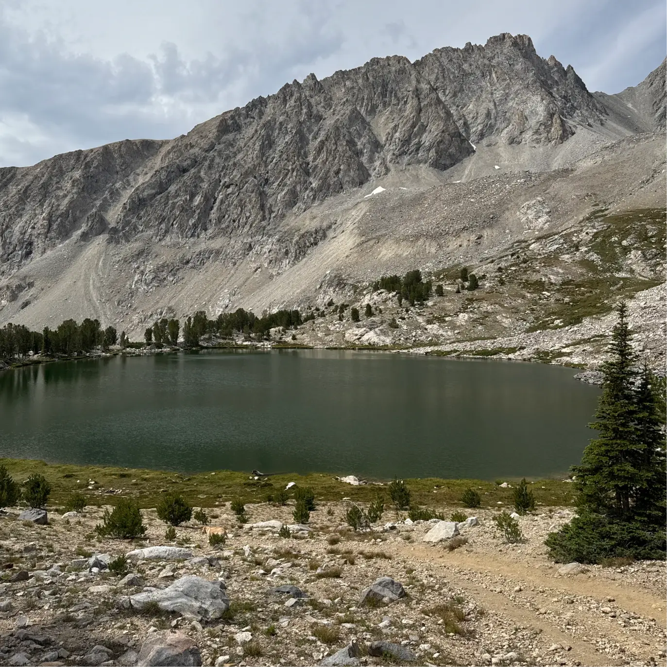 The trail continues to be poorly defined through some of this stretch, but keep the unnamed lake to your left and Betty Lake to your right until you reconnect with the path. It climbs one last time until you mercifully come up and over a 10,765 foot saddle. Goat Lake sits 300 feet below the saddle.