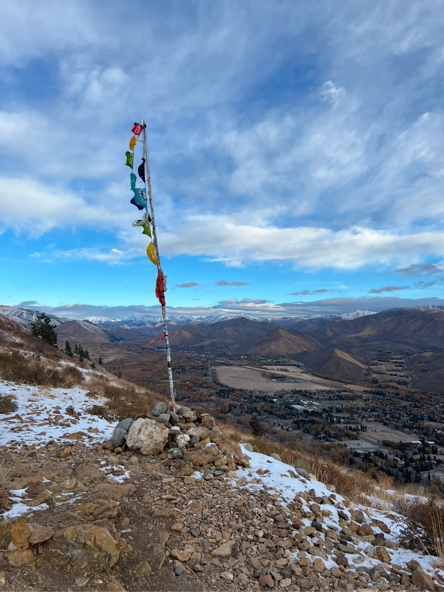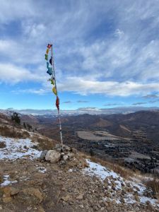 The trail finally does ease just a bit for a few steps just before the .8-mile mark but then rises again. At one mile, come to a pole adorned with several small Tibetan prayer flags. Looking up the hill from the pole presents a view of your final push, still a quarter mile away.