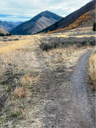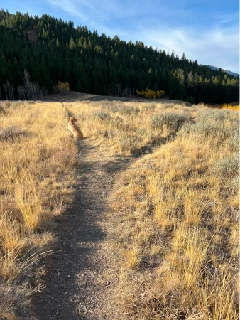 As you descend the short hill, you will hear Trail Creek flowing from down the slope to your right. As you complete the wide left turn, Bald Mountain will dominate the horizon before you. The trail continues along the right edge of the top level of the meadow and eventually the beautiful Trail Creek comes into view. Just after the 2-mile mark, there is a four-way junction. If you have a dog, we suggest taking a right turn and heading down the hill towards the creek. At the bottom of the hill, take a hard left turn to continue along the path. At 2.2 miles, there is an excellent watering hole for dogs.