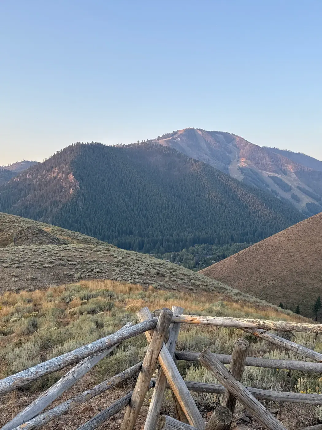 As you continue climbing, views open to the Warm Springs side of Bald Mountain. There is another junction at .67 miles. Veer right and shortly afterwards come alongside an old barbed wire fence. Just after the .8-mile mark, come to a vista point looking towards Baldy and Ketchum.