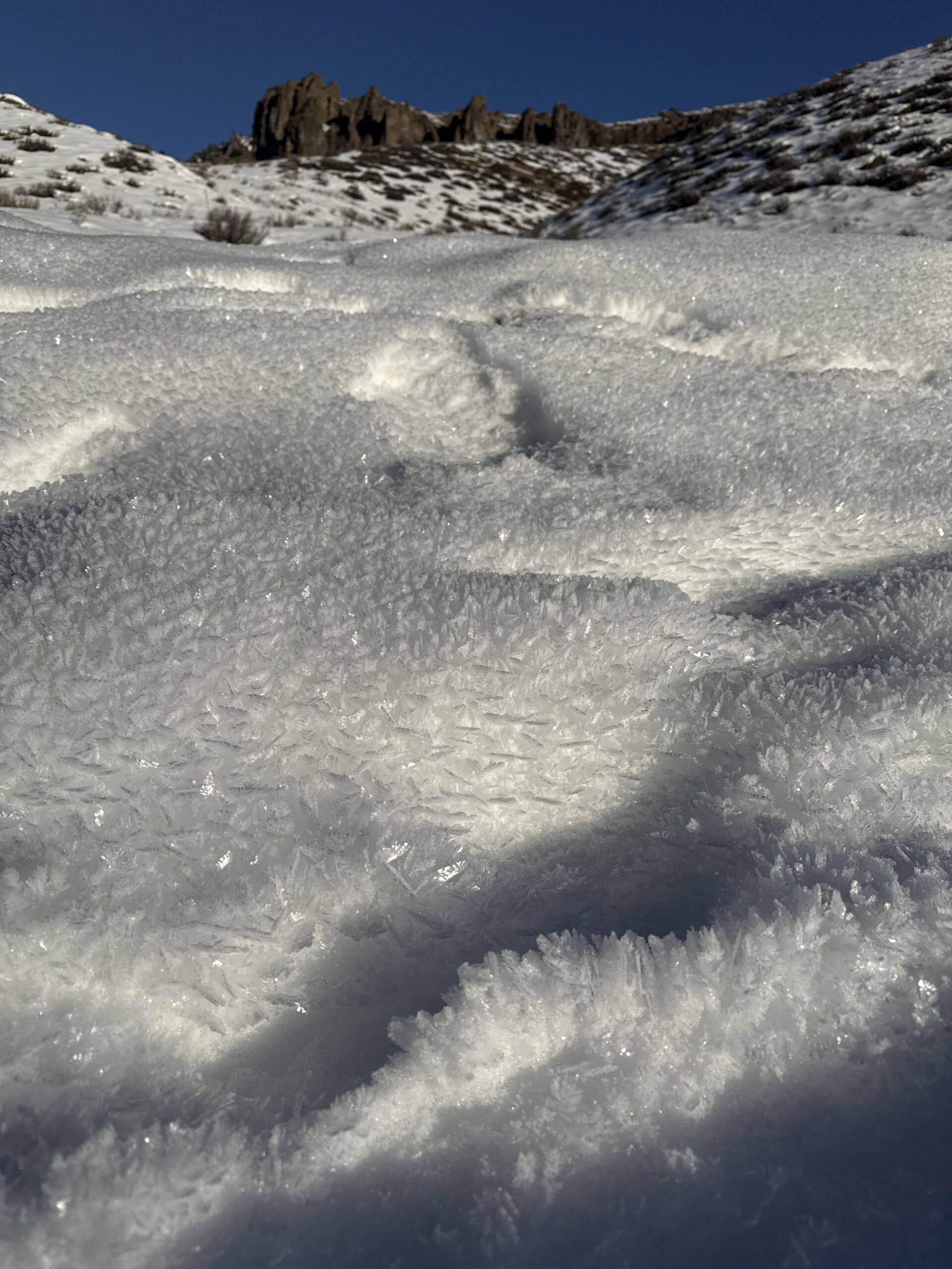 The climb intensifies as you come upon an open ridge. As the trail winds along, beautiful views open to the north and there are over-the-shoulder views back towards Ketchum. This section receives heavy sun and undergoes an extreme freeze-thaw cycle, so it is highly compressed and can be icy. Watch your step along the narrow ridge.