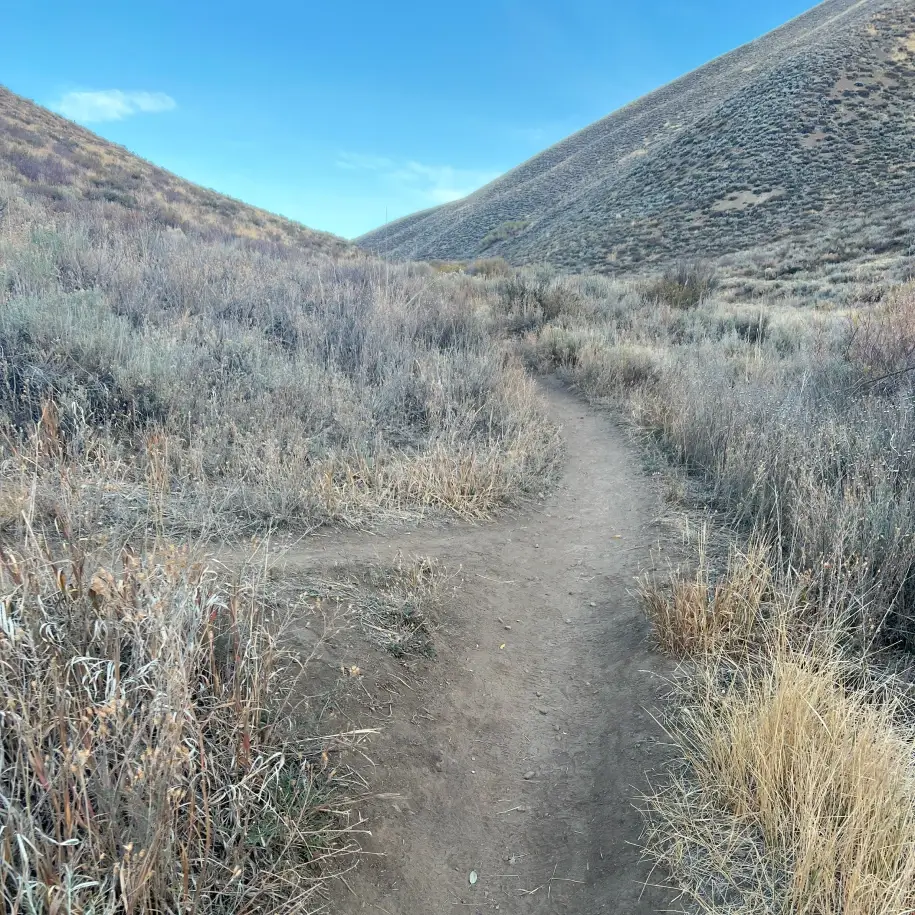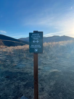 From the Sun Valley Clubhouse parking lot, cross Trail Creek Road to get to the large trailhead sign. Keeping that sign to your left, begin a slight climb, passing two intersections within the first hundred yards, staying left at each. The trail rises gradually at the bottom of an open hill. Condos and mansions in the White Clouds neighborhood are directly to your left.
