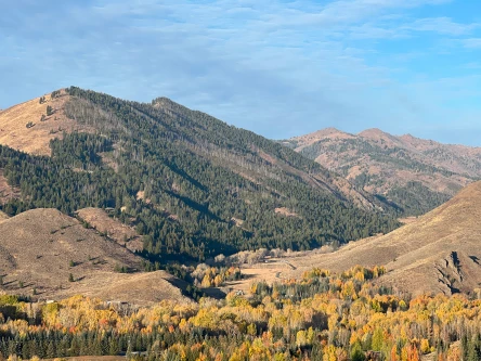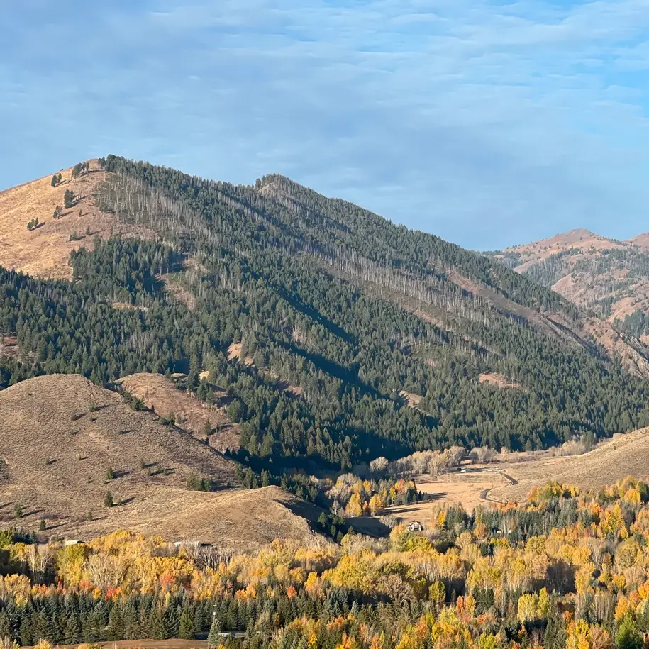 The high road marks the start of a pleasant gently rolling ridgeline walk over a valley that hosts a few Big Wood mansions. As you continue along, the Bigwood Golf Course becomes visible and the Wood River Valley opens in front of you offering views as far as the Adam’s Gulch trailhead and the tree-covered Smoky Mountains.