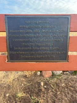 Moving along the trail, views of downtown Ketchum appear, the city laying at the bottom of Bald Mountain. At 1.7 miles the White Clouds golf course comes into view. The trail continues to wind along the hillside. At 2.3 miles, take the junction left and take the short climb to the destination, a grassy area with views down the White Clouds difficult 5th hole. There is a bench honoring Kelley Elizabeth Goldmanis, a young woman who died of cancer in 2021. Her memory is marked with a reminder to “Look around, take a deep breath. . .”