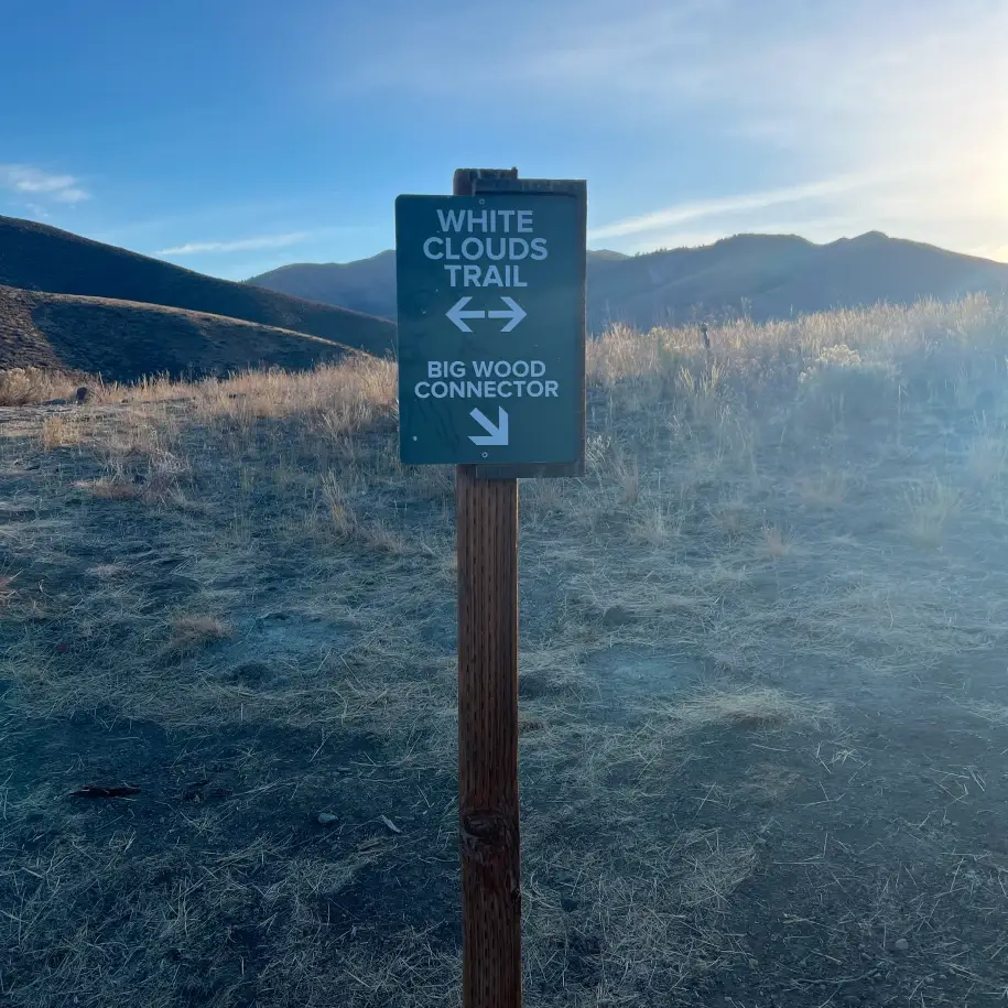 As you curl around a small rocky knob, Ketchum’s Big Wood neighborhood lays in the trees in the valley to your right. At .9 miles, come to a signed junction of White Clouds and the Big Wood Connector. Continue straight and access the high road that turns to the right.